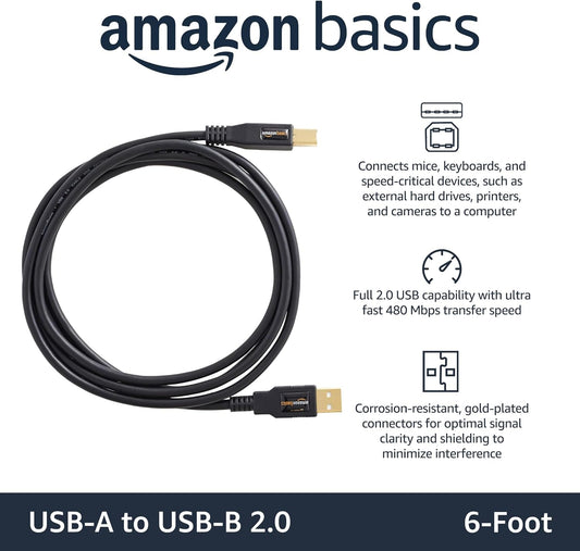 USB 2.0 Printer Cable - A-Male to B-Male Cord - 6 Feet (1.8 Meters), Black